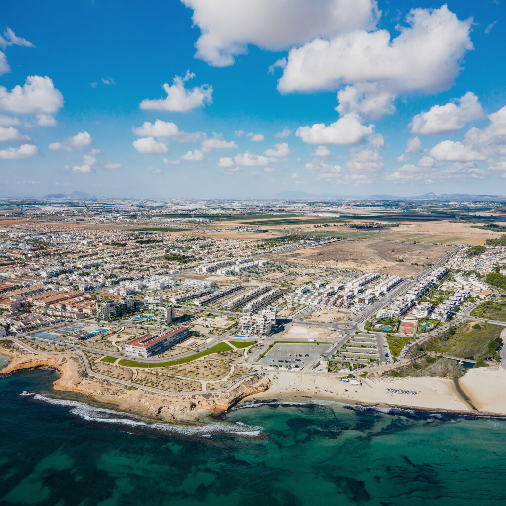 The Orihuela Costa stretches in a triangle from the city of Orihuela to the 16 kilometres of coastline panning the Mediterranean. The varied landscape combines sierras, orchards and palm groves, but it’s the succession of resort towns, rocky headlands and sandy coves that have made it popular with tourists. Many of the resorts have disabled facilities (like the lifts up the seawall surrounding Punta Prima), kid’s playgrounds and a range of sports amenities, making the area attractive to people at all stages of life, from young families to retirees.