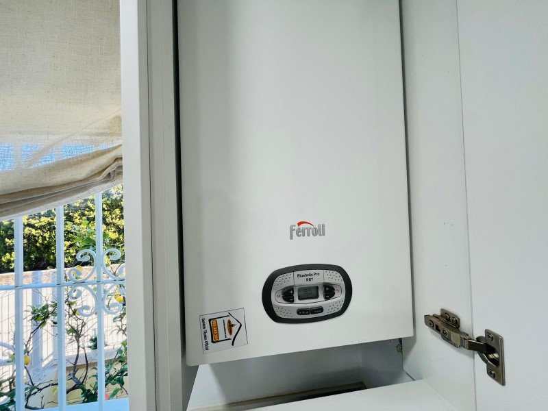 At the front of the house, a small garden terrace creates a welcoming entrance. Upon entering the property, the fully fitted modern kitchen is located on the right, equipped with a built-in washing machine, microwave oven, and fridge/freezer. This area also houses the new central heating system.