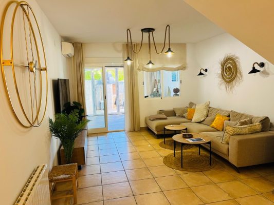 The living room is bright and spacious, featuring air conditioning and subtle mood lighting, creating a warm and comfortable atmosphere. The former covered naya has been fully glazed and can be completely opened, transforming it into a generous dining area that seamlessly connects indoor and outdoor living.