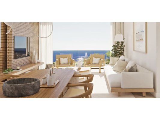 Inside, an open-plan living and dining area with an integrated kitchen welcomes you with space, light, and seamless connection to the outdoors. The soft palette of neutral tones and light wood brings warmth and balance, while large panoramic windows frame breathtaking views of the Mediterranean Sea.