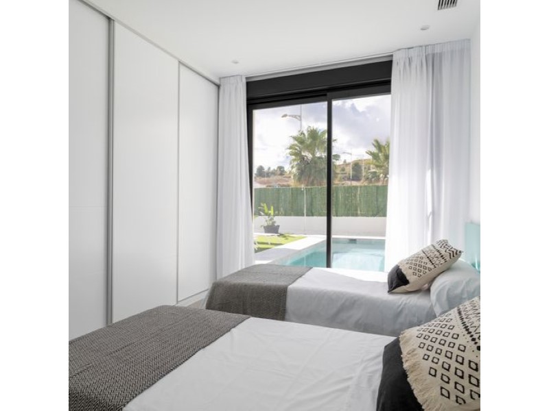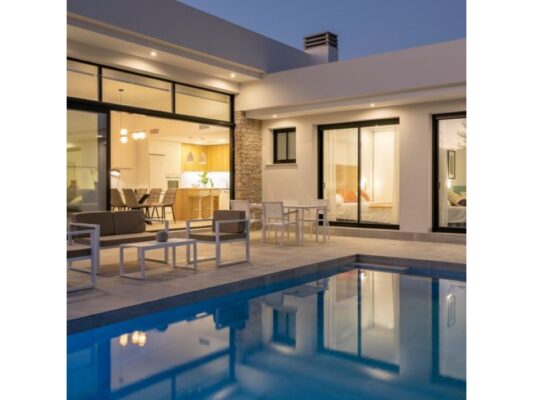 Modern style detached villa with enclosed plot, swimming pool, three bedrooms.
