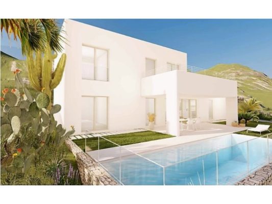 The villa is distributed over two floors with the following layout: on the ground floor there is an open plan living/dining room with access to the covered terrace and the pool, an open plan kitchen, a bathroom and a bedroom. An internal staircase leads to the upper floor with 2 additional bedrooms and a bathroom as well as an open terrace from where you can enjoy the beautiful sea views. Outside there is an easy to maintain Mediterranean garden, a private 8 x 4 m swimming pool and a covered carport for one car.