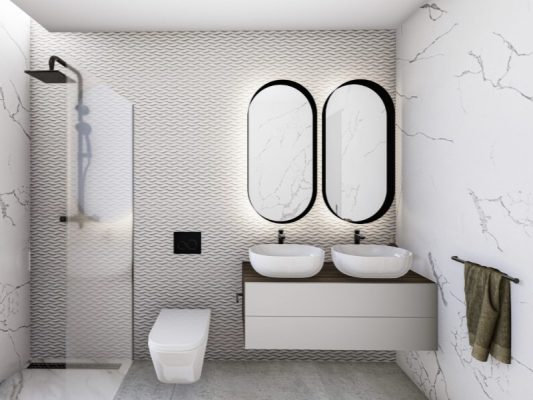 Fully fitted bathrooms with vanity unit, suspended toilet with built-in tank, mirror, rainfall shower and shower screens.