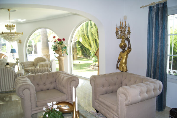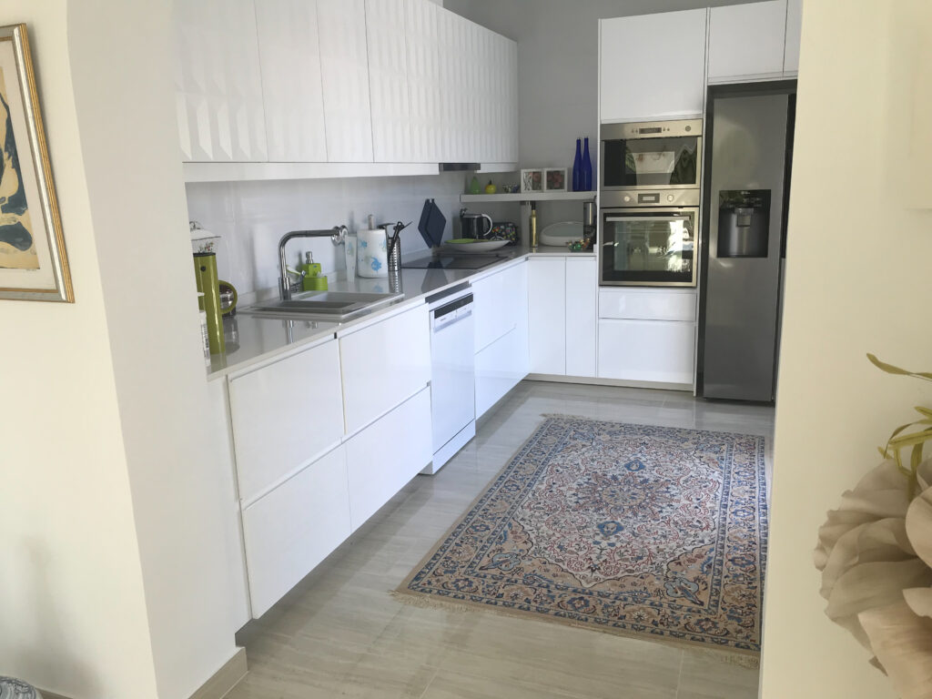 The villa is surrounded by a lovely green garden with palm, olive and pine trees. At the back of the garden there is a lovely large pool and a large outdoor kitchen. The entire inside of the villa is kept in bright, white and beige colors with giant windows facing the green garden. The ground floor will be fully renovated in 2020.